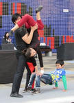 みえないボールを投げて、紙袋に入れるパントマイム。