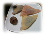 八橋の手前、梅干みたいのは、余ったチョコとイチゴの餡を団子にしたものらしい。