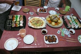 買って、母から煮物もらい、プレゼントはアイスケーキ