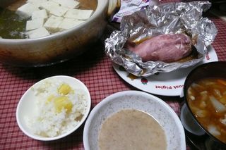 さつまいもご飯と、豚汁と、湯豆腐と、イカのワタ焼き。