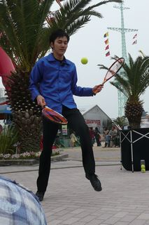 テニスラケットと、テニスのホールをつかってのジャグリング。