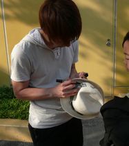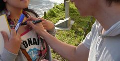 ヒッツ君に寄せ書きをお願いする。
