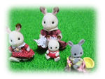 ショコラウサギのお母さんと女の子と赤ちゃんと、ワタウサ&三輪車です。