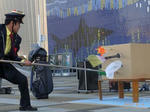 段ボールに女性が入って、橋からナイフや、鉄棒などをつきさします。