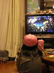 なぜか水泳帽をかぶってTVにくぎ付けになっていた