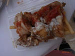 鶏を鉄板でやいて、トマトソースとヨーグルトソースをかけたもの。