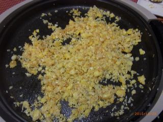 冷凍庫にご飯があったので、チンして、簡単なチャーハンをパエリアあとのホットプレートで作ることにしました。