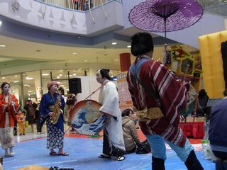 しかしチンドン屋さん・・・そこ、土足禁止のブルーシートの上です。