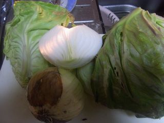 父の畑でとれた、新キャベツと新玉ねぎです