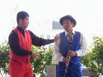 赤い方がジャグリングをして、青い方がクラリネットを吹いています。