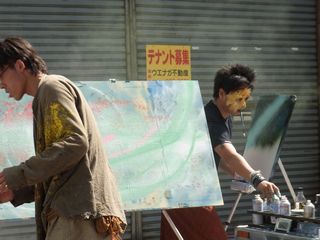 大きなべニア板?・・それにお互いに絵を重ねて、重ねて、