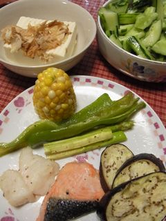 甘長と、茄子と、アスパラと、とうもろこしも一緒焼きました。