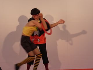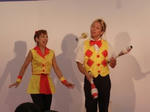 この衣装でクラブを取りあいっこしているジャグリングをして
