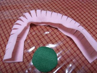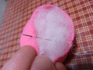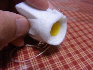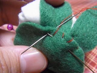額(緑のフェルト直径3cmぐらい)をまつり縫いして、