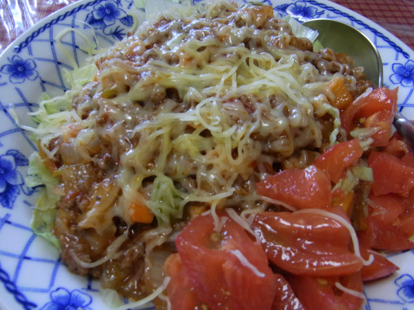 ご飯の上にレタスの千切りのせて、上のひき肉のトマト煮いれて、チーズ(とろけるタイプ。写真はピザ用)乗せて、トマトのざく切り添えて