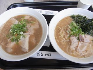 これ、どっちかが味噌ラーメンで、どっちかが醤油ラーメンです。