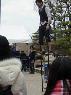 ジョニーさんは片足で綱に乗り、クラブジャグリングをされていました