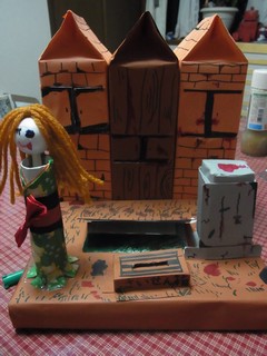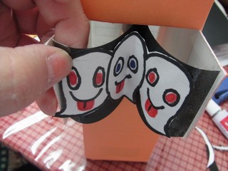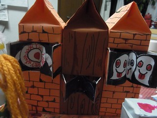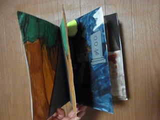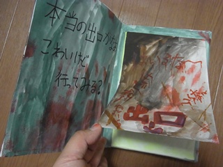 後ろに通ってる画用紙を押すと、この扉が開いて、お化けが現れる・・・というしくみです。