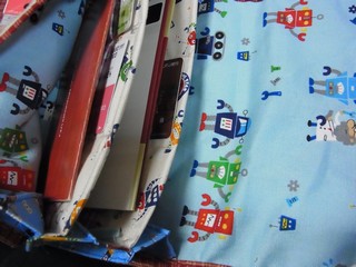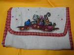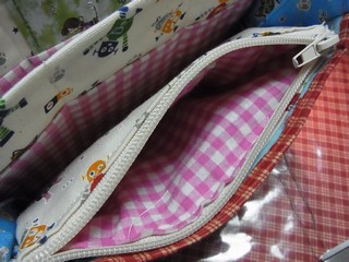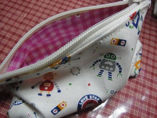 ピンクチェックの布を内布にして、ポーチをつくる。