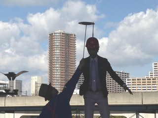 皿回しをして、ローラーのって、頭の上で回すという技。