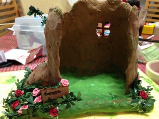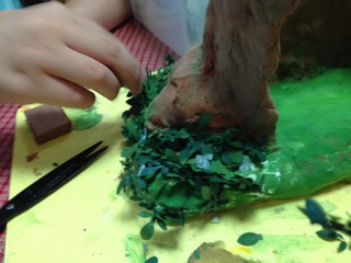 紙ネンドを土台の板につけてから、緑に塗りました。