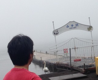 霧でここのようなボート小屋も休みだから、餌くれる人がきてくれなくて