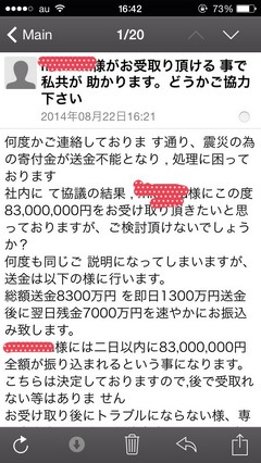 「震災の寄付用のお金が送金できなかったから、あなたにあげる」的なメッセなんだけどさ。