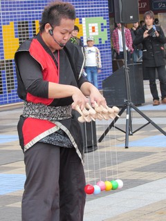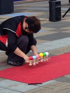 ヒモのついたけん玉1つ、2つと技を決めていきます。