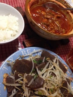 こんにゃくとモヤシを油引かずにテフロンのフライパンで焼いたもの。