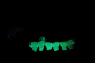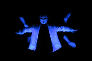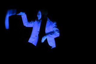 暗闇の中浮き出る白い肘から下の手、仮面、スーツ。