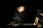 舞台の端で砂絵を描く人。