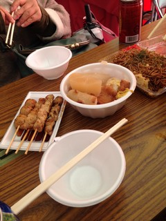 出店でおでんと焼き鳥と、焼きそば食べて、