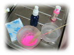 材料は、保冷剤の中身、香水、絵の具(絵の具は任意)、かきまぜる棒、容器。