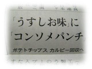 カルビーの「うす塩味」の袋に、「コンソメパンチ」味の粉末を入れてしまったらしい。