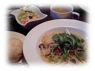水菜ときのこのペペロンチーノと、サラダ、パン(食べ放題)、ドリンクのセットで、820円だったかな?