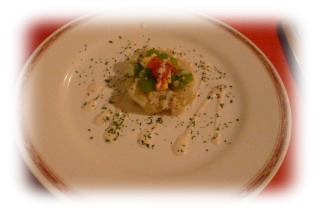 前菜が、ポテトとマメのタルタル メインは、若鶏のグリル濃厚トリフソースでした。